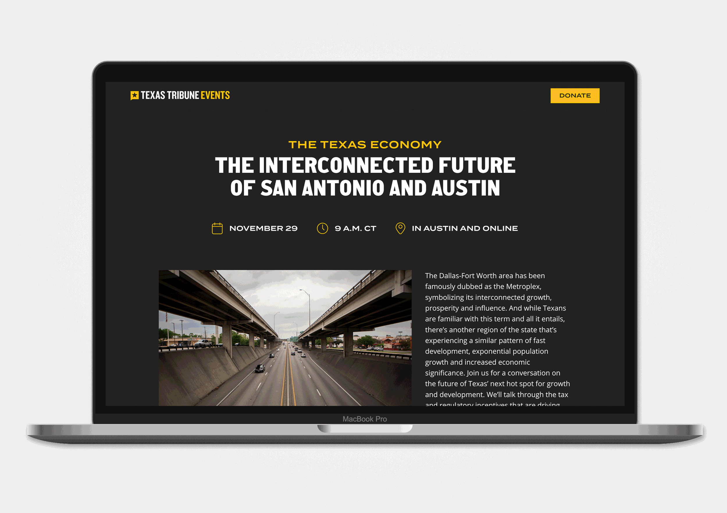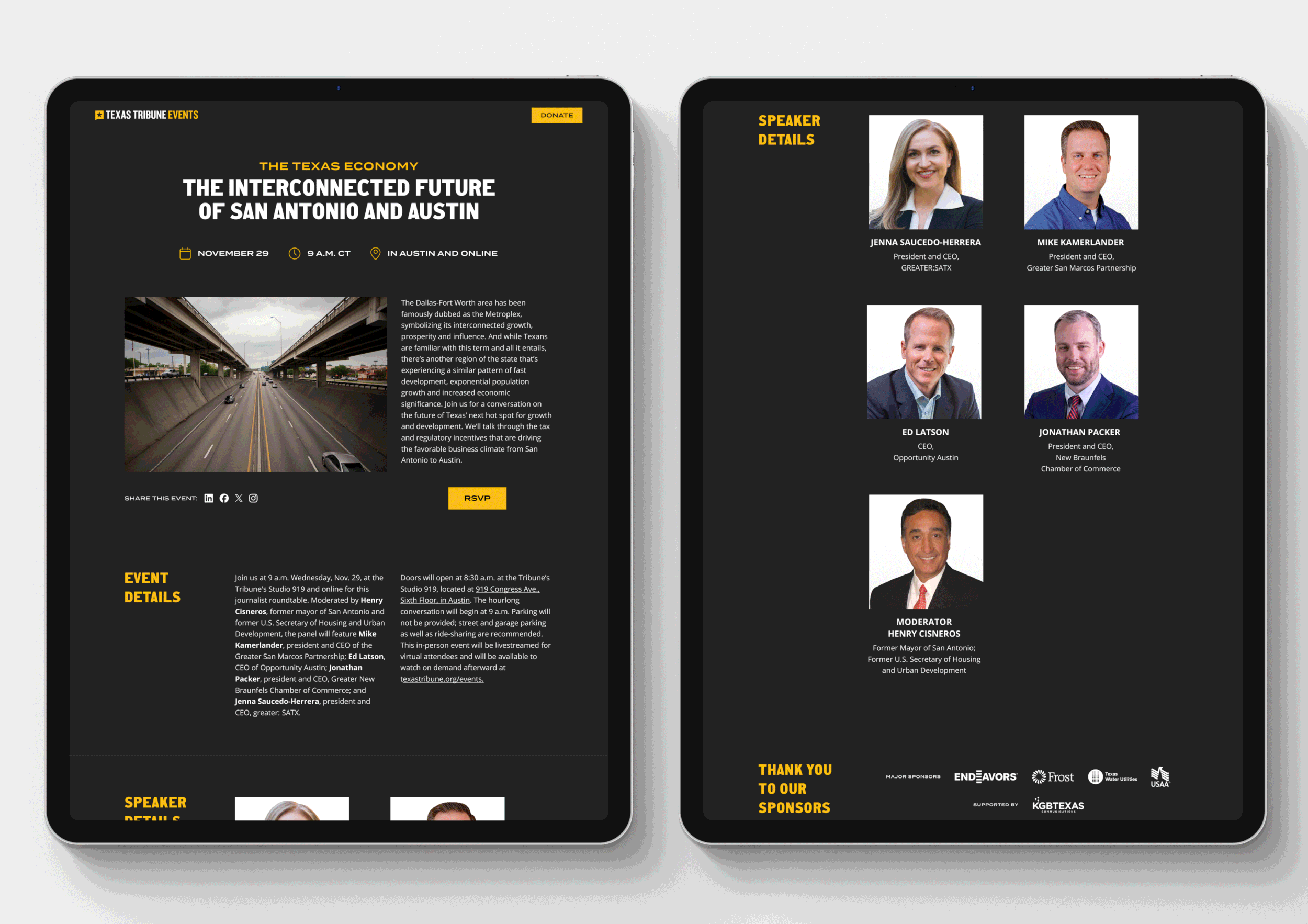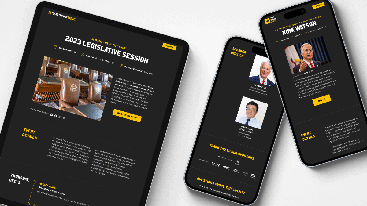 Texas Tribune Events are a series of statewide public forums and live discussions covering politics, policy, and civic engagement. Attendees RSVP through dedicated landing pages, which serve as the primary info hub and conversion point for each event.