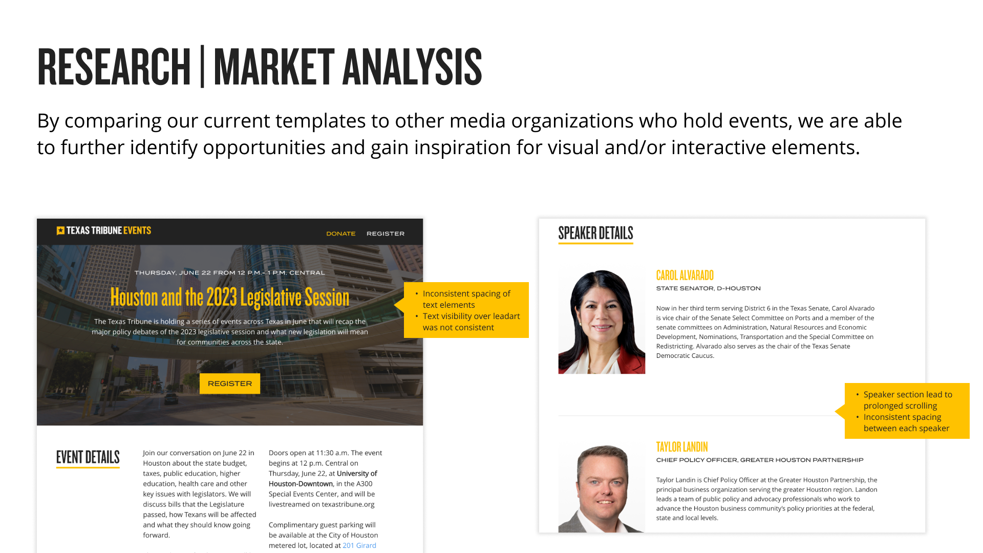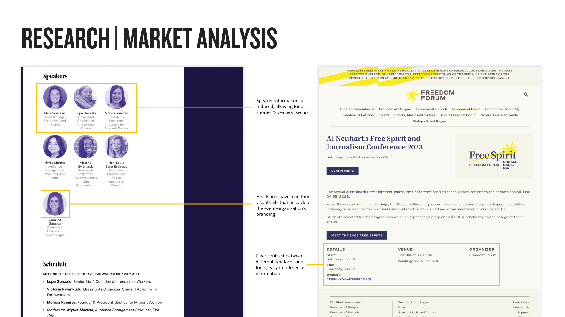 Both internal and market analyses helped define visual gaps and position our landing pages alongside competitors in the newsroom events space.